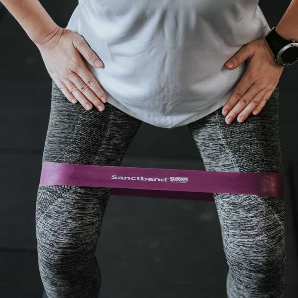 Puedes hacer abducciones sentadas o colocar las Sanctband Miniloop por encima de la rodilla y luego colocarte en una silla o banco, manteniendo las rodillas separadas. Luego, abre y cierra las piernas para que la banda ejerza resistencia y los glúteos trabajen.
