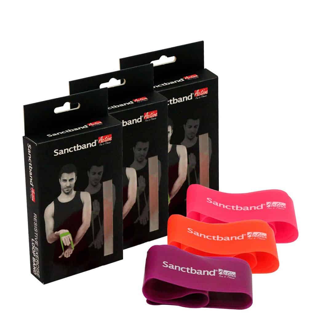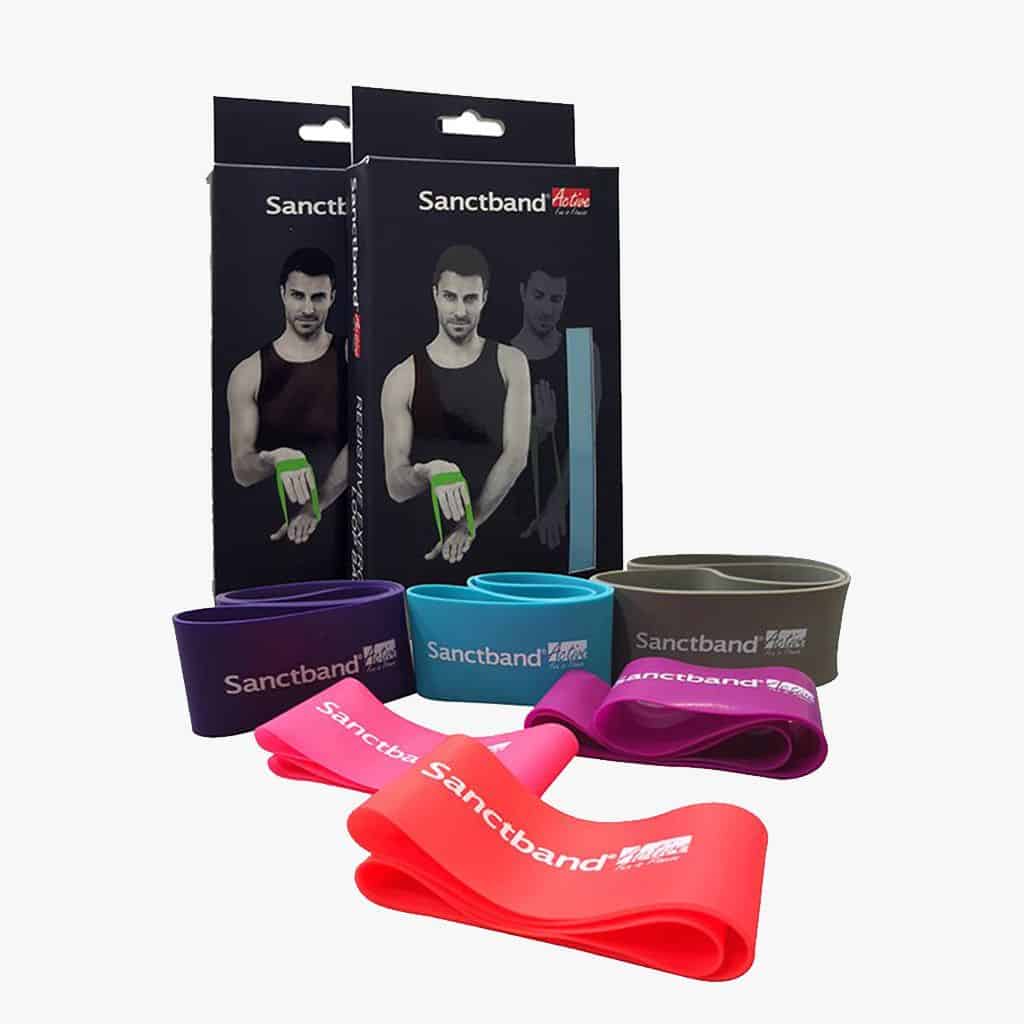 Sanctband Loop Band disponible en material de látex de caucho natural. Es una Banda de bucle continua que tiene un ancho de 5 centímetros y una longitud total de 33 centímetros. Sanctband Loop Band está disponible en cuatro tipos de resistencia.